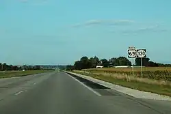 US 65 leaves the Iowa 330 expressway at the interchange with Iowa 117 north of Mingo. US 65 and Iowa 117 form the northern and southern branches, respectively, of a crossroad. The expressway portion of Iowa 330 extends on for 20 miles (32 km), passing the communities of Rhodes and Melbourne. It meets US 30 at a diamond interchange just west of Marshalltown. 1+1⁄2 miles (2.4 km) later, now on a two-lane road, Iowa 330 turns north of Albion, bypassing Marshalltown to the west.[1] On the way to Albion, Iowa 330 crosses the Union Pacific Railroad main line and the Iowa River.[3] North of Albion, Iowa 330 turns east and travels 4 miles (6.4 km) before ending at Iowa 14.[1]