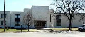 The current building was built in 1955.[10] It cost over a million dollars: "The new building cost a little over $1,000,000. it is constructed of Vermont Marble, with grey marble from Carthage, Missouri, lining the interior halls. The metalwork in the windows, doors and stair rails is of bronze. The main portion of the building is over 245 feet long and 50 feet wide, while the library wing at the west end is 113 feet deep."[2]
