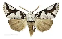The caterpillars of Ipana egregia feed in summer on Araliaceae species, especially five-finger (Neopanax arboreus), mountain five-finger (N. colensoi), and lancewood (Pseudopanax crassifolius).[4][5] They are well-camouflaged, resembling a small bird-dropping when young and a Pseudopanax fruit when older. Larger larvae, up to 30 mm (1.2 in) long, look like lichen-covered twigs and hold themselves stiffly out from the host plant by their prolegs.[5] The moth overwinters as a pupa on the forest floor, in a loosely-spun cocoon encrusted with dirt.[5]