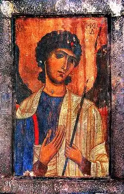 Like many other medieval churches in Svaneti, the Iprari church—owing to its remoteness—served as a safe repository of pieces of Christian art. Touring the region in 1910, the Georgian scholar Ekvtime Taqaishvili reported at least a dozen of old church items, including a now-lost 13th-century triptych of the Virgin and Child, which also depicted the ktitor David, apparently King David VII of Georgia, as suggested by mentioning David and his wife Gvantsa in another inscription on the icon.[2][note 2] Preserved in the iconostasis of Iprari is the 12th–13th century icon depicting the archangel Michael and the Deesis.[2]