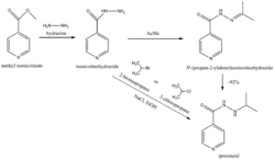 One synthesis pathway involves AcMe which results in the formation of N'-(propan-2-ylidene)isonicotinohydrazide. Subsequently, the C=N linkage is selectively hydrogenated in the presence of a platinum catalyst and with water, alcohol or acetic acid as solvent.[14][15]