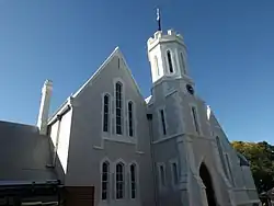 This complex of buildings is made of brick and stone, which was subsequently rendered and painted. Various small weatherboard-clad additions have been made to it. The main wings of the complex are in the Gothic Revival style and currently comprise classrooms, a Great Hall, towers, residential accommodation, some offices and a number of meeting rooms. Originally, its siting on an eastward-sloping incline had addressed the city centre across an intervening valley. However, the view of its impressive mixture of steeply pitched, parapeted gables, longitudinal ridgelines, and crenellated octagonal towers, has been masked by later development on the campus.[1]