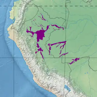 The Iquitos várzea has an area of 11,499,547 hectares (28,416,000 acres) in northwest Brazil, northeast Peru and northern Bolivia. The várzea, or flooded forest, is found along seasonally flooded basins of tributaries of the upper Amazon River, and of the Amazon itself.[1] To the west the Iquitos várzea extends to the highest places where várzea is found in the Amazon region. The eastern boundary is defined by the Iquitos arch, an ancient crystalline arch that crosses the Amazon basin.[2] Beyond this arch the Iquitos várzea ecoregion merges into the Purus várzea ecoregion.[3]