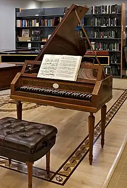 The center has several musical instruments on display: an original 1827 Viennese fortepiano, a reproduction of a 1795 Dulcken fortepiano, a clavichord, and a harpsichord.[5] The Dulcken fortepiano, which has a range of 5 octaves over 66 keys, is a copy of an original held by the Smithsonian Institution.[9] Visitors are allowed to play the Dulcken fortepiano, clavichord and harpsichord.