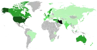 In 2021, the Ministry of Foreign Affairs of Iran published statistics which showed that 4,037,258 Iranians are living abroad, an increase from previous years. However, this number includes people of Iranian ancestry living in the United Arab Emirates, Kuwait, Israel, Turkey and Bahrain whose families left Iran many years, if not many decades, prior to the 1979 revolution. This number also includes people with only partial Iranian ancestry.[1][2] Over one million of these people and their extended families live in the United States, with anywhere between 100,000 and 500,000 living in countries such as Australia, Canada, Germany, Israel, Sweden, Turkey, and the United Kingdom. Additional communities exist in numerous other countries, including many European nations, China, India, and the United Arab Emirates, along with several other Middle Eastern and Levantine nations.[4][5] Many of these individuals relocated to other countries following the Iranian Revolution.[6][7]