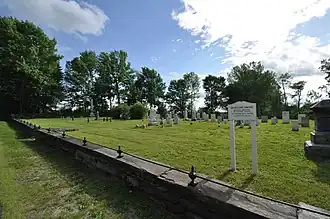 The Ireland Street Cemetery is in southwestern Chesterfield, on a rise above the Westfield River which flows north-south to the east of Ireland Street, the town's major north-south route on its west side, and one of its oldest roadways. The approximately 1-acre (0.40 ha) plot lies on the west side of Ireland Street, surrounded by fields and orchards. The plot is demarcated by stone walls, the eastern one also acting as a retaining wall, because the plot is raised above the road. This wall is made of random fieldstones topped by several courses of flat stones and capped by a course of quarried granite. These are topped by urn-shaped fenceposts connected by a single iron rail. The entrance is in the center of the wall. Burials are arrayed in rows, oriented to face east.[2]