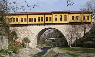 The bridge is a single arc bridge. Arch span is 16 metres (52 ft) and the width is 11 metres (36 ft).[3] It is an example of a rare type of covered bridge which houses a bazaar. It has been claimed (incorrectly) locally that it is one of only four bridges in the world having shops.[4] Other bridges with shops on them are Ponte Vecchio and Ponte Rialto in Italy; Osam Bridge in Bulgaria; Pulteney Bridge in Avon, High Bridge in Lincoln, and "Frome Bridge" in Frome in the United Kingdom; and Krämerbrücke in Erfurt, Germany. In the original design there were thirty shops on the bridge.[5] According to Ass. Prof Önge during the Ottoman times, the bridge was also used to check traffic between two neighborhoods of Bursa by closing during the nights.[3]