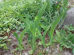 It has basal leaves (rising from the rhizome), that are curved,[4] acuminate (pointed) and 1–3 cm wide.[3][4] They are slightly smaller than Iris aphylla,[5] and shorter than the flowering stem.[2] They have 5–6 ribs,[3] and curve outwards.[4]