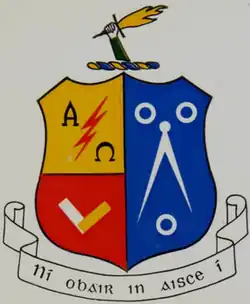 The school's motto, as it appears below the crest is "Ní Obair In Aisce Í", meaning "There is no work without gain".