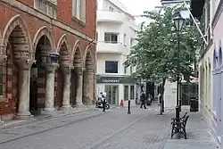 Tito Benady calls Irish Town the second most important street in Gibraltar's city centre after Main Street. It was originally named Calle de Santa Ana (Spanish: St. Anne's Street) after a hermitage which carried this name at the corner with Market Lane. The Mercedarian Fathers established themselves in Gibraltar in 1581 and built their monastery around the little chapel, however, the street retained its name. The monastery later become known as the White Cloisters and formed part of an order established in Barcelona in 1380 for ransoming Christian captives in Muslim hands. The site of the old monastery is now occupied by Cloister Building which houses the offices of Blands and MH Bland. The building may have been used as barracks for some time, but was handed over to the Royal Navy by Lord Portmore in 1720 becoming the naval storehouse with apartments for the victualling clerks. The original building however, was destroyed during the Great Siege of Gibraltar (1779-1783). Four of the old columns of the old monastery's cloister were removed and now flank the entrance to Trafalgar House at Trafalgar Road.[1]