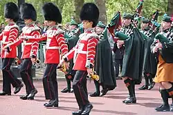 | Irish Guards | 1900–present | Part of the Guards Division, founded by order of Queen Victoria to commemorate the Irishmen who fought in the Second Boer War. The regiment are also known as the Fighting Micks. Like other Guards regiments, the Irish Guards wear bearskins and redcoats as their ceremonial dress. |