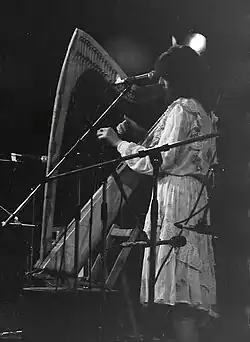 Eithne Pádraigín Ní Bhraonáin of the Irish folk music band Clannad playing the harp at the Leeds Folk Festival, 1982