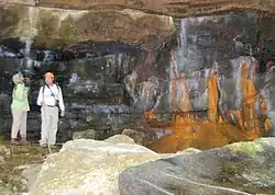Ferrous and ferric iron are components in many minerals, especially within sandstones. Fe2+ is in clay, carbonates, sulfides, and is even within feldspars in small amounts. Fe3+ is in oxides, hydrous, anhydrous, and in glauconites.[8] Commonly, the presence of iron is determined to be within a rock due to certain colorations from oxidation. Oxidation is the loss of electrons from an element. Oxidation can occur from bacteria or by chemical oxidation. This often happens when ferrous ions come into contact with water (due to dissolved oxygen within surface waters) and a water-mineral reaction occurs. The formula for the oxidation/reduction of iron is: