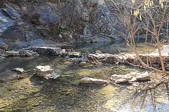 The Iron Springs picnic area is set on the west side of Arkansas Highway 7, about 4.5 miles (7.2 km) north of Jessieville, between the road and the Middle Fork Saline River. The river is impounded by a low fieldstone dam, built by the CCC in 1933, which features alternating chutes and steps, and impounds enough water to form a modest swimming hole.[2]