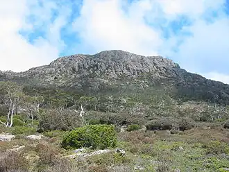 With an elevation of 1,444 metres (4,738 ft) above sea level,[1] the mountain is the highest peak of the Great Western Tiers[2] and has a nearby companion lake, Lake Ironstone. The highest point is marked with a trig point, but more dominant is the slightly lower part of the mountain depicted here in the information box.