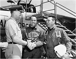 ![]() Major General Irving L. Branch (left) shakes hands with F-111 test pilots Fred Voorhies and Val Prahl. | |
