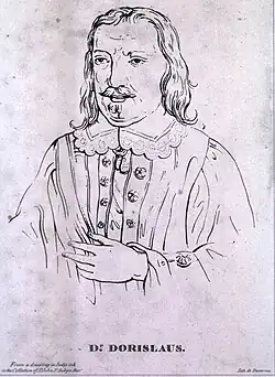 From a strongly Calvinist family, he was educated at Leiden.[2] He arrived in England as the University of Cambridge's first ever professor of History.[3][4] From the outset he attacked the legitimacy of kings and justified revolt, as when he emphasized the Anglo-Saxon roots of England before 1066, emphasizing what he saw as democratic freedom enjoyed by all Englishmen before they lost it to the Norman conquerors and also justified the Dutch uprising against Spain. His apparent propagandizing for republicanism and regicide was seen as aimed at the King Charles I of England, who was suspected of Catholic sympathies and failure to uphold the country's interests against powerful foreign enemies. Despite his thinly veiled condemnation of the reigning royal power, little real action was taken against him apart from his doctorate being delayed. In 1629 he was admitted a commoner of the College of Advocates. In 1632 he made his peace at court, and on two occasions acted as judge advocate, in the Bishops War of 1640 and in 1642 in the army commanded by the Earl of Essex.[2] Despite his early advocacy of freedom from untrammelled power, once ensconced in a position of authority, Dorislaus attempted to sweep away legal protection for the accused. He assisted in preparing the charge of high treason against Charles I but was not prominent in the proceedings themselves.[5]