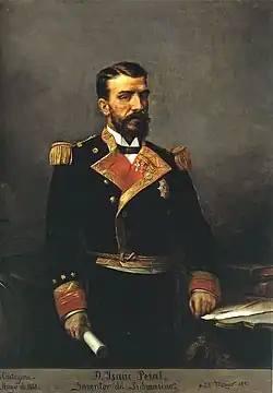 Isaac Peral y Caballero (1 June 1851, in Cartagena – 22 May 1895, in Berlin), was a Spanish engineer, naval officer, and designer of the submarine Peral. He joined the Spanish Navy in 1866, and developed the first electric-powered submarine which was launched in 1888. It was not accepted by political authorities, but it was accepted by the navy. He then left the navy to develop other inventions commercially.