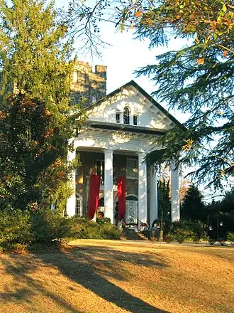 As the National Register nomination notes, the three-story house is "an unusual example of eclecticism", blending neo-Gothic and neoclassical elements that include six Doric columns, a Palladian window, a castellated tower, two rooftop patios, and a massive porte-cochère.[4] Stone for the random bond masonry was in part taken from a mid-nineteenth-century grist mill on the Reedy River owned by Greenville founder Vardry McBee.[5]