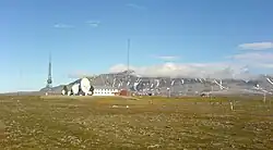 At first the Norwegian Broadcasting Corporation's (NRK) radio broadcast was sent to Svalbard Radio and broadcast as medium wave. NRK was not satisfied with the quality and in 1969 started planning a better transmission system. They concluded that it would be necessary to build a microwave radio relay between Isfjord Radio and Svalbard Radio. As a temporary solution, a reception antenna was built at Kapp Linné and a reception antenna in Longyearbyen. Construction of the relay was approved in 1972 and carried out the following year. A reflector was built on Sokolovfjellet and the system had a capacity for 120 lines.[13] The reflector blew down in a storm on 5 March 1976, and a temporary connection with four lines could not be reestablished until 1 April. Sokolovfjellet was considered unsuitable and the reflector was instead installed at Kapp Starostin. Because of the size of the reflector it could not be flown up and not until the summer could the relay be re-established.[5] However, delays resulted in that installation had to wait until May 1977.[14] The coast radio station was unmanned in 1976 and remotely controlled from Svalbard Radio, which had moved to the tower at Svalbard Airport, Longyear.[13]