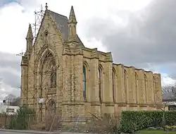The chapel was designed by Sir Charles Barry,[1] shortly before he designed the Palace of Westminster (Houses of Parliament). It was constructed between 1837 and 1839 out of sandstone, with a slate roof. It is in English Gothic Revival style. The building has seven narrow bays, with buttresses and a lancet in each bay. The west end has a giant moulded archway, with an arched doorway at the ground floor with a window above. On the east end there is a rose window. The corners are square, with pinnacles. The inside of the chapel had galleries on three sides, and a ribbed, vaulted ceiling. The attached two-storey Sunday School is in the same style as the chapel, and has a triple-gabled north side, with large arched windows on the first floor. It also has a canted apse on the west end, and a lean-to porch.