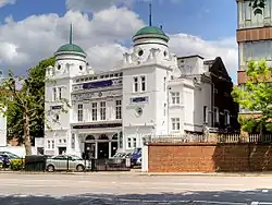 The centre is housed in the former Maida Vale Picture House, a 1,001-seat cinema designed by Edward A. Stone (one of his earliest works)[24] which opened as the Picture Palace on 27 January 1913.[25] The building has two copper-topped towers and a central dome; the auditorium, with oak walls decorated with gilded plaster,[24] originally had a small circle with curtained boxes, and an entrance vestibule with a marble floor and an open fire, with a tearoom above it. Provincial Cinematograph Theatres acquired it in 1920 and renamed it the Picture House in 1923. It was in turn acquired in 1927 by Associated Provincial Picture Houses, who reopened it that September with a new organ, and in 1929 by Gaumont British Theatres, who closed it in November 1940 because of the Second World War. In 1949, after alterations, it was reopened by Mecca Dancing as the Carlton Rooms, a ballroom which was the location of BBC dancing broadcasts. It was converted again into a bingo club[26] in 1961 and became a Grade II listed building in 1991.[27] Jasmine Bingo, the then operator, closed it in 1996.[25]