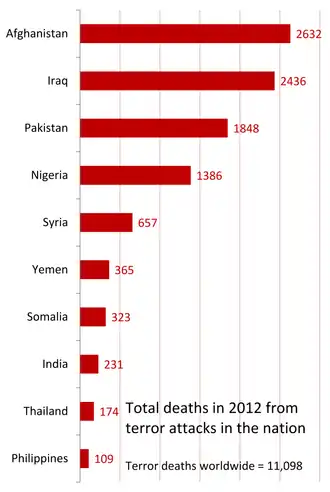 In 2022, India ranked 13th on the Global Terrorism Index.[11] India continues to face a number of terror attacks from Islamist separatist groups in Kashmir, Sikh separatists in Punjab, and secessionist groups in Assam.[5] The regions with long term terrorist activities have been Jammu and Kashmir, east-central and south-central India (Naxalism) and the Seven Sister States. In August 2008, National Security Advisor M K Narayanan said that as many as 800 terrorist cells are operating in the country.[12] As of 2013, 205 of the country's 608 districts were affected by terrorist activity.[13] Terror attacks caused 231 civilian deaths in 2012 in India, compared to 11,098 terror-caused deaths worldwide, according to the State Department of the United States; or about 2% of global terror fatalities while it accounts for 17.5% of the global population.[4]