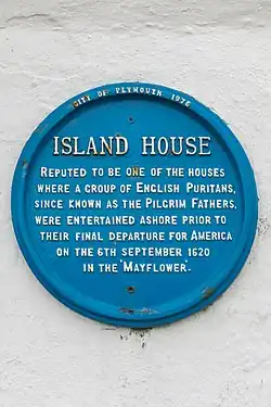 A blue plaque from 1976 can be found beside the shop entrance describing Island House as "one of the houses where a group of English puritans, since known as the Pilgrim Fathers, were entertained ashore prior to their final departure for America on the 6th September 1620 in the 'Mayflower'".