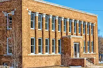 The Island Woolen Company Office Building is an office building located in Baraboo, Wisconsin, United States, along the Baraboo River. The "island" where the building is located is actually a horseshoe bend in the Baraboo River. In 1839–1840 a dam and sawmill was built across the Baraboo River. In 1863 The Island Woolen Mill was constructed[1] on the east side of the bend, with a raceway constructed to deliver water to the mill. The mill operated mostly successfully through the 1800s and by the early 20th century needed more space.[2] The office building was built in 1917 and housed offices for the Island Woolen Company.[3] It was built in the prairie school style by Claude and Starck architects from Madison Wisconsin, McFetridge the owner of the company, who had worked with and consulted with Frank Lloyd Wright, contributed to the design and finish of the building.[3] The mill and office building continued to operate until its closure in 1949. The mill's dam was removed in 1997.[1]
