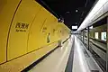 All Island line stations except Heng Fa Chuen and Chai Wan have their Chinese station names written in Chinese calligraphy as part of the stations' livery. A retired architect involved in the design of the Island line, Abe Au Kit-tong,[8] explained that the calligraphy is written in large fonts to alleviate the psychological effect caused by the narrow platforms and the curvature of the walls, in addition to reminding passengers what the stop is.[9] This explains why Heng Fa Chuen and Chai Wan stations do not have calligraphy forming part of their livery, as they are built above ground rather than underground. This feature is also shared amongst some newer MTR stations such as those on the Tseung Kwan O line and Lam Tin station on the Kwun Tong line.