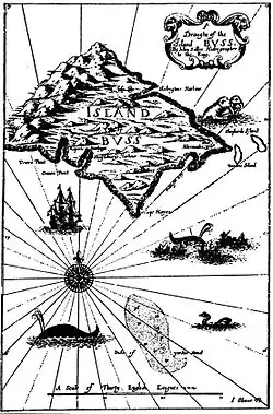 Bus, Buss, or Busse Island was a phantom island in the North Atlantic Ocean. It was recorded as discovered during the third expedition of Martin Frobisher in September 1578 by sailors aboard the ship Emanuel of Bridgwater (a "busse") and was indicated on maps as existing between Ireland and mythical Frisland at about 57° N. The island was then named for the type of vessel that its discoverers used.[2] It is believed that Frobisher took Greenland for Frisland and Baffin Island for Greenland and Emanuel, returning home, made a mistake in dead reckoning and mistook optical effects near Greenland at around 62° N for new land.