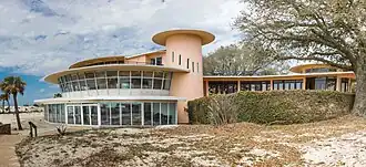 The Isle Dauphine Club is a historic social club in Dauphin Island, Alabama. The club was developed by the Dauphin Island Property Owners Association, and came to encompass the main club building, a restaurant, swimming pool, tennis courts, and a golf course. The Mid-century modern main club building was completed in 1957 and consists of three floors. The main room on each floor features circular walls, with windows facing the Gulf of Mexico. The golf clubhouse was completed in 1962, and the golf course was built the following year.[2] A restaurant has occupied the building since 2015.[3]
