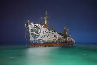 The Greek Ship is the wreck of a 1943 cargo steamship, the Koula F, on a beach on Kish's southwest coast.[10] She was originally a British ship, Empire Trumpet, and was built in Scotland.[10] In 1966, she ran aground and all attempts to salvage her failed.[10]