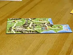 The auction phase begins, proceeding clockwise from the starting player, with each player able to purchase one of the landscape tiles from an opposing player at the price established by the opposing player.[1] To end the round, any landscape tiles remaining in front of a player must be purchased by the player.[1] All purchased landscape tiles are placed in the player's clan territory, with the restriction that landscapes must match on the edges of abutting tiles.[4]