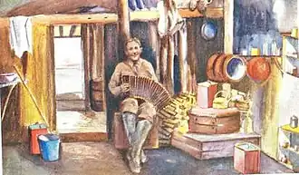 At the end of October, she went to visit Tom Gordon, a giant Scotsman who had been a whaling ship captain, but had been forced to become a trader after his ship was destroyed by the ice. He lived, with his native wife and their many children, in a two-roomed cabin with a lean-to. Hutchison described it as a Scottish-Eskimo household filled with characters, and stayed here for seven weeks.[63]