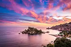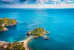 Isola Bella (Sicilian: Ìsula Bedda) is a small island near Taormina, Sicily, southern Italy.[1] Also known as the Pearl of the Ionian Sea, it is located within a small bay on the Ionian Sea; it was a private property, for a time owned by Florence Trevelyan, until 1990, when it was bought by the Region of Sicily, being turned into a nature reserve, administered by the Italian branch of the World Wide Fund for Nature. There is a narrow path that often connects the island to the mainland beach. The island is surrounded by sea grottos and has a small and rather rocky beach which is a popular destination for sunbathers.