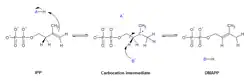 Isopentenyl-diphosphate delta isomerase type I (also known as IPP isomerase) is seen in cholesterol synthesis and in particular it catalyzes the conversion of isopentenyl diphosphate (IPP) to dimethylallyl diphosphate (DMAPP). In this isomerization reaction a stable carbon-carbon double bond is rearranged top create a highly electrophilic allylic isomer. IPP isomerase catalyzes this reaction by the stereoselective antarafacial transposition of a single proton. The double bond is protonated at C4 to form a tertiary carbocation intermediate at C3. The adjacent carbon, C2, is deprotonated from the opposite face to yield a double bond.[14] In effect, the double bond is shifted over.
