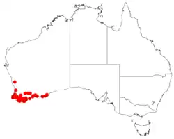 This isopogon grows in woodland with a heathy understorey, in scattered population from near Perth to Albany and Mount Manypeaks, in the south-west of Western Australia.[2][3]