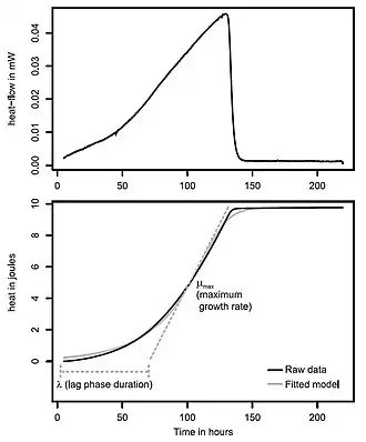 - ^ a b Braissant, O; Bonkat, G; Wirz, D (2013). "Microbial growth and isothermal microcalorimetry: Growth models and their application to microcalorimetric data". Thermochimica Acta. 555: 64–71. Bibcode:2013TcAc..555...64B. doi:10.1016/j.tca.2012.12.005.