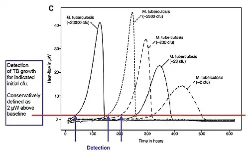- ^ Rodríguez, D; Daniels AU; Urrusti JL; Wirz D; Braissant O (October 2011). "Evaluation of a low-cost calorimetric approach for rapid detection of tuberculosis and other mycobacteria in culture". Journal of Applied Microbiology. 111 (4): 1016–24. doi:10.1111/j.1365-2672.2011.05117.x. PMID 21797951. S2CID 205324227.