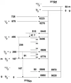 A detailed spectroscopic study of the production of 257Rf nuclei using the reaction 208Pb(50Ti,n)257Rf allowed the identification of an isomeric level in 257Rf. The work confirmed that 257gRf has a complex spectrum with 15 alpha lines. A level structure diagram was calculated for both isomers.[51] Similar isomers were reported for 256Rf also.[52]