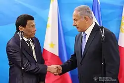 In September 2018, President Rodrigo Duterte was in Israel for a four-day visit, making him the first sitting Filipino president to visit the Jewish state.[8] President Duterte sought to reaffirm the people-to-people ties between the two nations based on their significant shared history.[9]