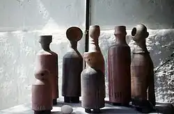 As ceramics drew closer to the field of art, however, foreign influences also creeped into the Israeli tradition. Siona Shimshi, for example, during these years returned from studies in the United States, where she had been exposed to postmodern art, such as Pop Art. Her ceramic works combined these influences with biographical works and psychological images. For example, in her works such as "Puppet Theater" [52] or "Class Photo 1939" (1965), the artist aimed to express psychological and social themes, something that was unusual in Israeli ceramics of the time.[53]