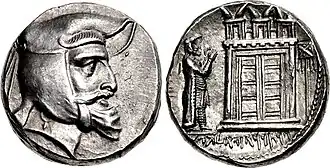 Baydad, the first recorded frataraka of Persis, early 3rd century BC. Coin minted in Istakhr. Obv: Baydad with short beard, mustache, earring and satrapal headdress (kyrbasia). Rev: Baydad standing to the left of a fire temple of Ahura Mazda, standard located on the other side of the temple