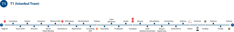 2. ^ a b c d e f g h i j k l "T1 Kabataş-Bağcılar Tramvay Hattı" [T1 Kabataş-Bağcılar Tramway Line]. Istanbul-ulasim.com.tr (in Turkish). İstanbul Ulaşim A.Ş. Archived from the original on 18 April 2014. Retrieved 17 April 2014.
