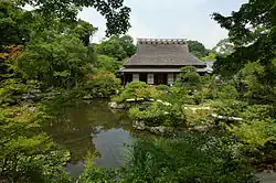 The site of the western garden originally formed part of Manishu-in, a minor temple which was part of the larger temple of Kofuku-ji. The ground was bought in the 1670, during the Enpō era by Kiyosumi Michikiyo, a wealthy tanner.[2] He restructured the gardens between 1673 and 1681 and built two houses: the Sanshu-tei and Tei-shu-Ken, as the family home. These were built with thatched roofs. The name Sanshu-tei ("house of the three wonders") was given by Mokuan, the large priest of the Manpuku-ji temple of the school Zen Oubaku with Uji.