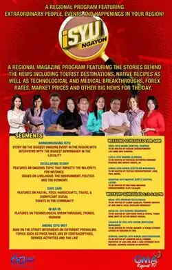 The Isyu Ngayon series (Issues Today) was a brand of regional news magazine shows of different GMA Regional TV stations in the Philippines. They were aired weekly in Dagupan, Cebu, Iloilo and Davao on Saturday mornings; and aired daily in Naga, Bacolod, Cagayan de Oro and General Santos. The Isyu Ngayon family of programs was not available in the Metro Manila market. Its editions in Naga, Iloilo, Bacolod and Davao were aired internationally via GMA News TV International.
