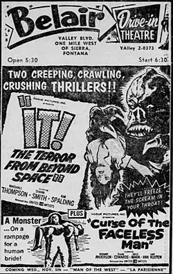 It! The Terror from Beyond Space is an independently made 1958 American science fiction horror film, produced by Robert Kent, directed by Edward L. Cahn, that stars Marshall Thompson, Shawn Smith (Shirley Patterson), and Kim Spalding.[1] The film was distributed by United Artists as a double feature with Curse of the Faceless Man.[2]