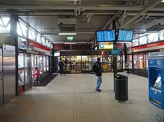 Itäkeskus metro station (Finnish: Itäkeskuksen metroasema, Swedish: Östra centrums metrostation - "Eastern Center") is a ground-level station on the Helsinki Metro.[2] The station was built on the grounds of the shopping center Itis, and serves the quarter of Itäkeskus in the neighborhood of Vartiokylä in East Helsinki. There are 240 bicycle and 420 car parking spaces at the station.[3] Itäkeskus is served by both M1 and M2 and acts as an exchange station between the two, as it is the easternmost station to be shared by both lines.