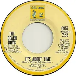 "It's About Time" is a song by American rock band the Beach Boys from their 1970 album Sunflower. Written by Dennis Wilson, Al Jardine, Bob Burchman and Carl Wilson, it was issued as the B-side of the "Tears in the Morning" single. Jardine said, "'It's About Time' was Carl, Dennis and I. That's a good one. I like that production. That was mostly Dennis, and I just helped with the lyrics. Dennis and Carl did the track."[2]
